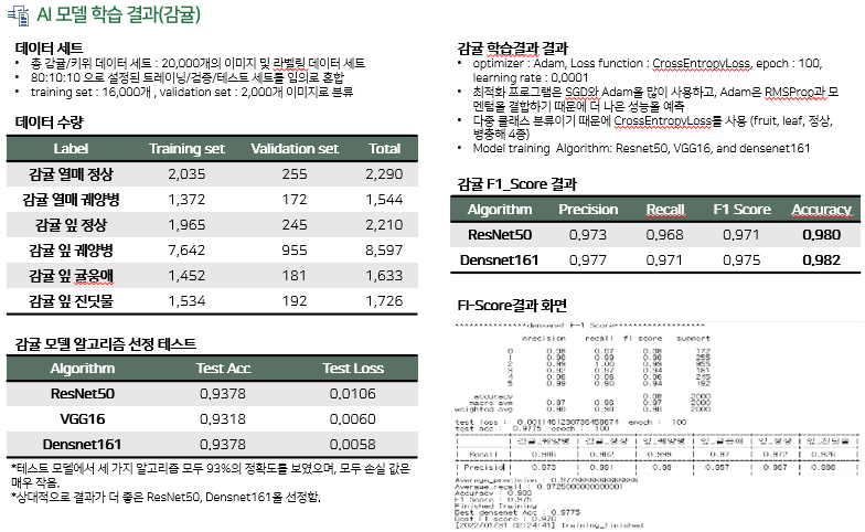 하지만, 궤양병, 귤응애, 진딧물, 점무늬병, 총채벌레, 과실무름병 등 다양한 케이스에 대해서 데이터셋을 확보하였기에 과일의 다양성은 적지만, 질병에 대한 다양성이 어느정도 갖춰져있습니다. 이 데이터셋을 통해서 귤과 키위에 대한 분석이나 인식에 대한 효과를 보게 된다면, 이후 추가적으로 다른 과일들에 대해서도 데이터셋을 구축해나갈 여지가 있다고 생각됩니다.