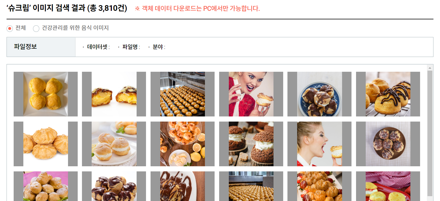 그래서 결국에 '음식 > 디저트 > 베이커리류 > 슈크림'을 선택했더니 (어딘가 최종 점에 도달하면) 이미지가 나타납니다!
