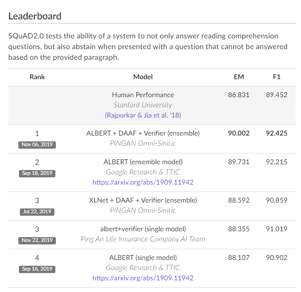 이미 발표된지 조금 되었지만(arxiv를 통해 2019년 9월 26일에 공개, 현재 ICLR 2020 리뷰 중) 좋은 성능을 보이고있는 ALBERT(A Lite BERT For Self-Supervised Learning of Language Representations)에 대해 알아보도록 하자. NLU(Natural Language Understanding)에서 성능을 평가하는 GLUE와 같은 Benchmark에서도 좋은 성능을 보였지만, 제게 특히 관심이 있던 것은 SQuAD였습니다. Question Answering 분야에 많은 관심을 갖고, awesome-list도 작성해보았는데요, 한번 쯤 둘러보셔도 좋을 것 같아요 :)