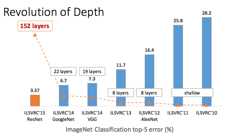 레이어 수의 증가폭이 ResNet을 통해 엄청나게 변화한 걸 볼 수 있습니다. (ResNet v2에서는 심지어 1000개 까지도...)