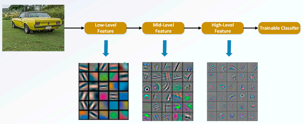 그런데 다른점은 무엇이냐면, 이전에는 multigrid를 만들어서 (이미지 크기를 다양하게 하거나, 필터 크기를 다양하게 해서) 각각을 계산하는 방식을 사용하였습니다. 기존의 CNN 구조에서는 이전의 것이 다음으로 전달되어 영향을 미치게됩니다. 입력부분에 가까운 하위 레이어에서는 매우 단순한 구조나 노이지한 패턴이 보이는 low-level feature가 학습이되고, 출력부분에 가까운 상위 레이어에서는 구조적인 부분이 학습되는 high-level feature가 학습됩니다.
