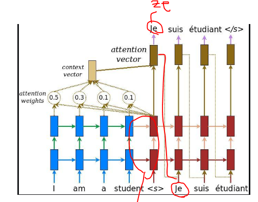 예를들어 I am a student를 Je suis etudiant 라는 문장으로 번역하는 것을 학습한다고 해봅시다. 디코더(빨간색)의 첫번째 스탭을 통해서 계산된 결과는 Je가 됩니다. I에 해당하는 것이죠. 그런데 이것이 Ze로 잘못 예측되었다고 해봅시다. (학습 초기에는 성능이 좋지 않기 때문에 잘못 예측될 경우가 많습니다.) 그러면 Ze가 다음 스탭에 전달될 것이고, 이것은 오류를 전달받는 것이 됩니다. 이전 출력값을 입력으로 받는 모델에서는 치명적이기에 학습이 제대로되지 않습니다. 따라서 이전 스탭에서 Ze로 출력이 되더라도 상관없이 그 다음 스탭에서는 정답인 Je를 이전 출력으로 입력받아 학습을 진행합니다. 1번 문제가 틀리면(사실 맞아도 상관 없이), 1번의 답을 알려주고 2번의 문제를 풀게하는 이 방법이 teacher forcing입니다. (실패가 최고의 선생님이라고 말하는 요다랑 다르게, 정답이 최고의 선생이라는 teaching forcing 기법...)