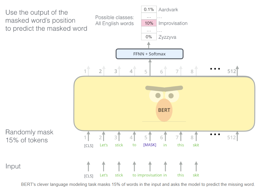 BERT는 인코더의 transformer stack을 학습시키는 방법으로 "masked language model"개념을 도입했습니다. 즉, 입력값에서 특정 토큰들을 masking(감추는 것)하고, 그 위치에 있어야 하는 토큰을 예측해내는 문제입니다. 입력의 15%를 masking하는 것 외에도 BERT는 나중에 모델을 fine-tuning하는 것을 향상시키기 위해 때로는 단어를 임의로 다른 단어로 바꾸고, 해당 위치에서 올바른 단어를 예측하도록 모델에게 요청합니다.