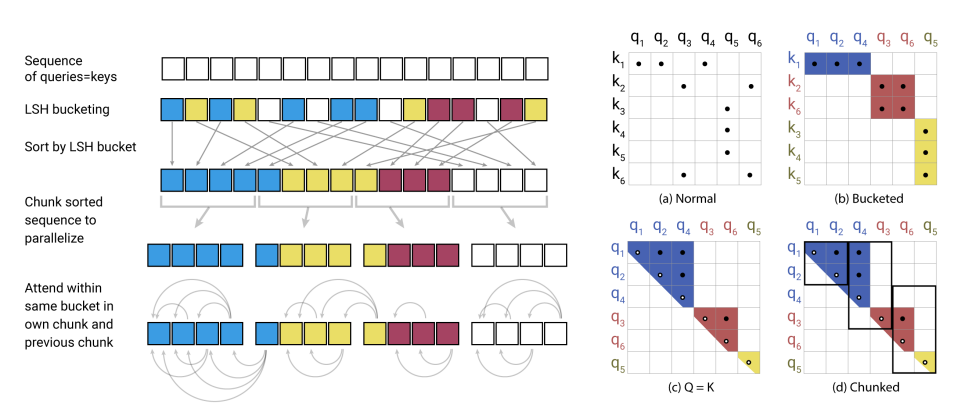 위 그림과 같이 먼저 초평면(h)를 이용해 공간을 나눕니다. 그리고 그것을 버킷으로 만들어 정렬합니다. (색으로 구분) 시퀀스를 청크 단위로 나누고, 버킷 내에서의 어텐션 관계를 계산합니다.