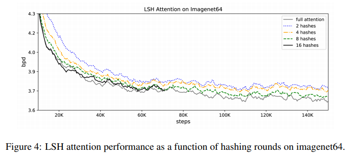 먼저 LSH 어텐션의 경우, 해시 라운드의 수에 다라 성능이 나뉘었습니다. 해싱을 안쓰고 전체 어텐션을 계산하는 것이 성능이 가장 좋았고, 해시 라운드 수가 많을 수록 성능이 유사하게 나타났습니다.