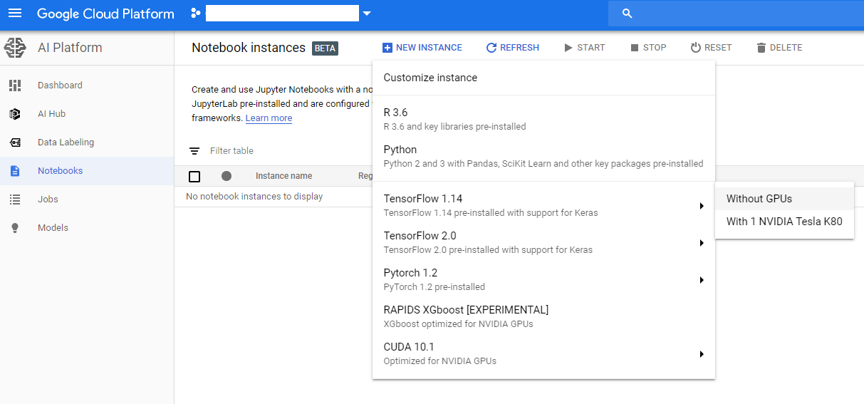- New Instance를 클릭하고, 원하는 환경을 선택합니다. (저는 Tensorflow 1.14에 GPU가 없는 것으로 선택하였습니다.)