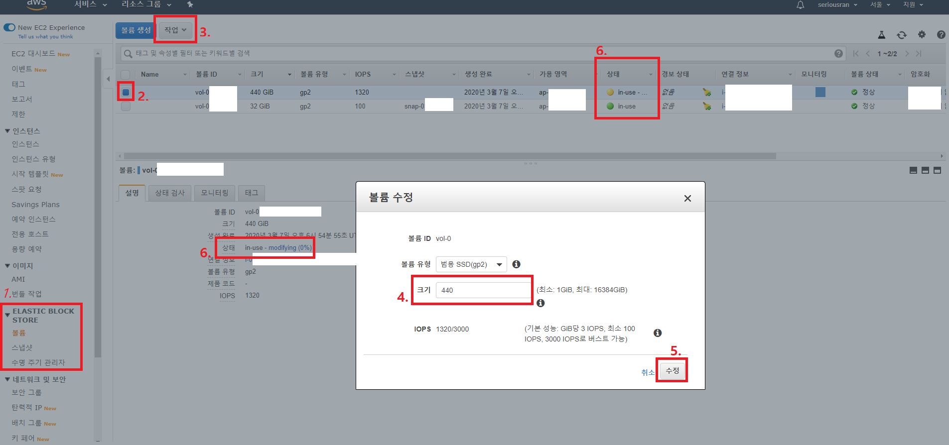 AWS -> EC2 -> Elastic Block Store -> 볼륨(1) -> 원하는 볼륨 클릭 후(2) -> 작업(3) -> 볼륨 수정(4) -> 크기 변경 -> 수정(5)