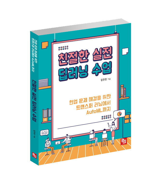 <친절한 실전 딥러닝 수업>이라는 제목으로 현업 문제 해결을 위한 트랜스퍼러닝에서 AutoML까지 다루는 책입니다! 회사, 대학, 도서관 등에서 #도서신청 많이 해주세요 :)