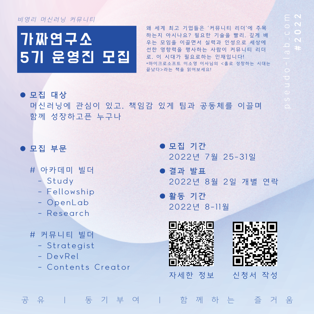 “홀로 성장하는 시대는 끝났다”라고 마이크로소프트 이소영 이사님이 말씀하셨습니다. 혼자 개발하고, 혼자 연구하고, 혼자 자축하는 과정을 반복하다보면... 번아웃이 오거나, 방향에 의심을 가져 방황한 적 없으신가요? 함께 성장하고자 하는 사람들이 가득한 가짜연구소에 여러분들을 운영진으로 초대합니다! 새로운 성장의 기회를 함께 기대하고, 만들어나가요!