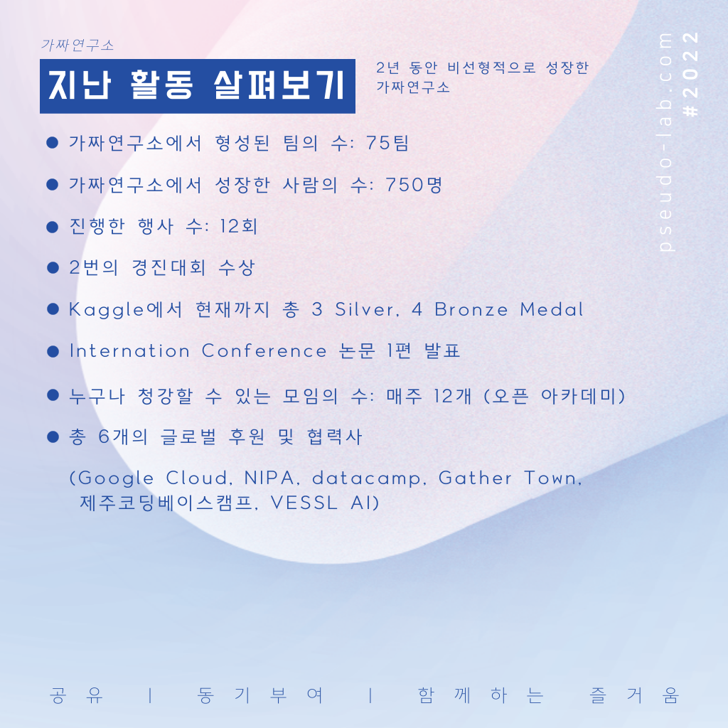 가짜연구소는 비영리 머신러닝 커뮤니티로, 스터디, 팀 프로젝트, Kaggle, 공모전, 논문 연구, 네트워킹 프로그램, 컨퍼런스 등 다양한 활동들을 진행해오며 함께 성장하는 것에 진심을 다했습니다. 성장에 대한 진정성이 있는 분들이 모여 공유, 동기부여, 함께하는 즐거움의 가치를 실현하고, 다양한 성과들을 이뤄냈습니다.