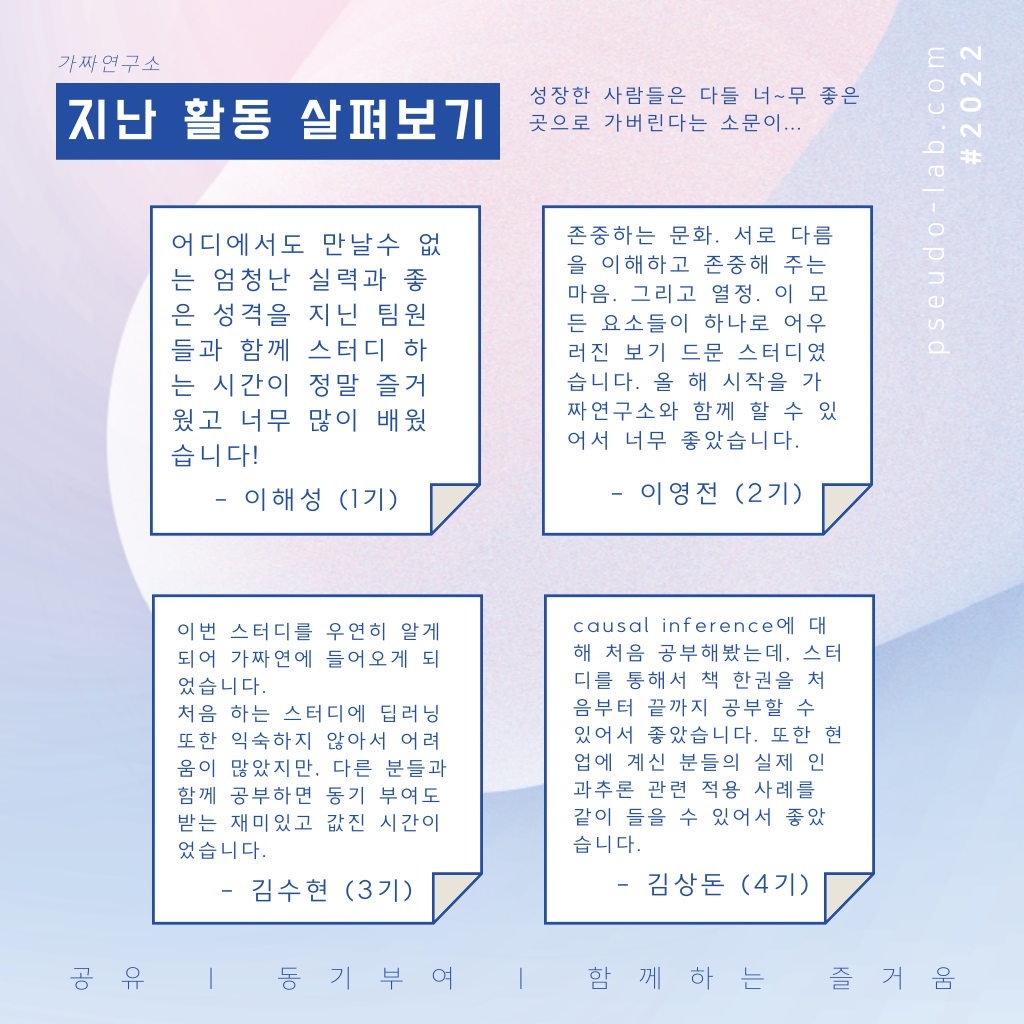 의미있는 성장과 성과, 함께하는 즐거움과 소중한 동료들과의 연대가 있었던 2022년의 상반기였습니다. 그럼에도 부족한 부분들은 분명히 있었습니다. 기수별로 나눠진 시간대에 참여하기 어려웠던 모임들도 있었고, 불분명한 목표나 부족한 동기부여, 의지로 중단된 팀들도 있었습니다. 그런것을 계속해서 보완하기 위해서 가짜연구소가 도움을 드리려 노력하고 있습니다! 특히 5기에서는 조직을 개편하고, 오픈랩과 리서치를 신설하여 이러한 부분을 보완하고, 커뮤니티 빌더의 역할도 구체화하여 도울 수 있는 부분을 집중해서 돕도록 노력하려고 합니다.